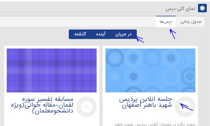 با کلیک گزینه درسها و سپس جلسات پردیس شهید باهنر وارد آزمون مورد نظر می شوید