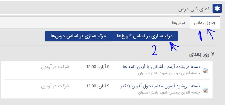 ابتدا گزینه جدول زمانی و سپس مرتب سازی بر اساس تاریخ را کلیک کرده وارد آزمون مورد نظر می شوید