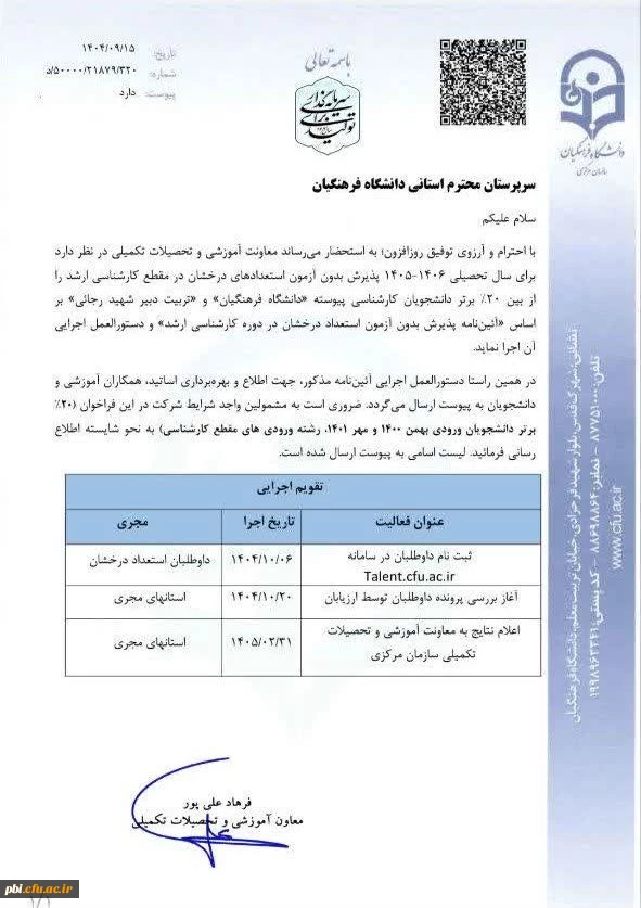 واجدین شرایط می توانند از روز شنبه 6 دی 1404 لغایت پنجشنبه 11 دی 1404 با مراجعه به آدرس http://talent.cfu.ac.ir نسبت به ثبت نام و بارگذاری مدارک اقدام نمایند.