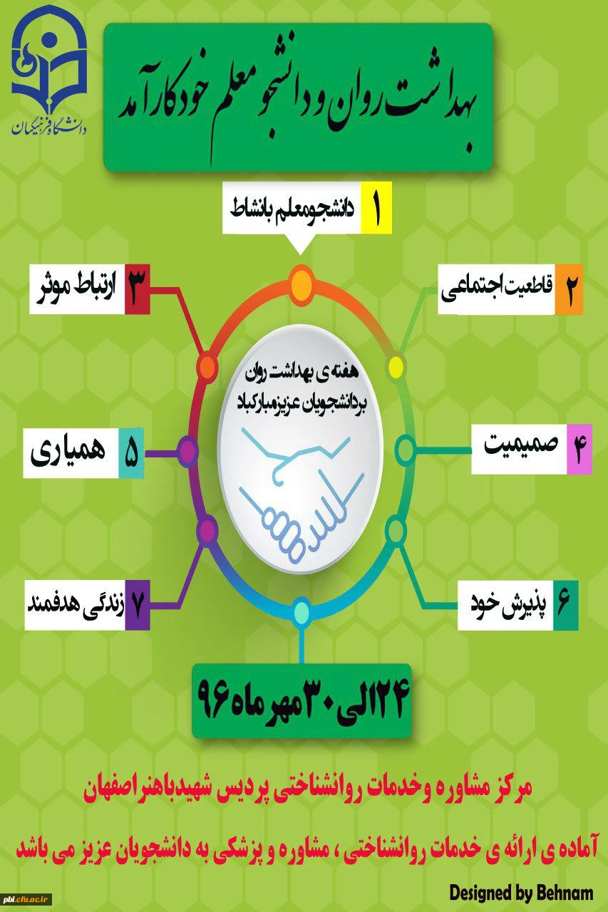 امتیاز دهید : روزشماربرنامه های هفته ی بهداشت روان در پردیس شهید باهنر اصفهان شنبه 29 مهر 1396 ساعت 11:02