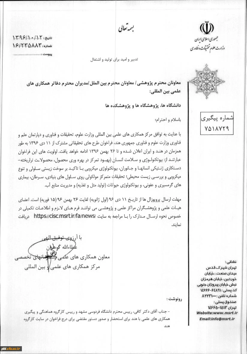 فراخوان طرح های تحقیقاتی مشترک مرکز همکاریهای علمی وزارت علوم و مرکز علم و فناوری وزارت علوم کشور هند،