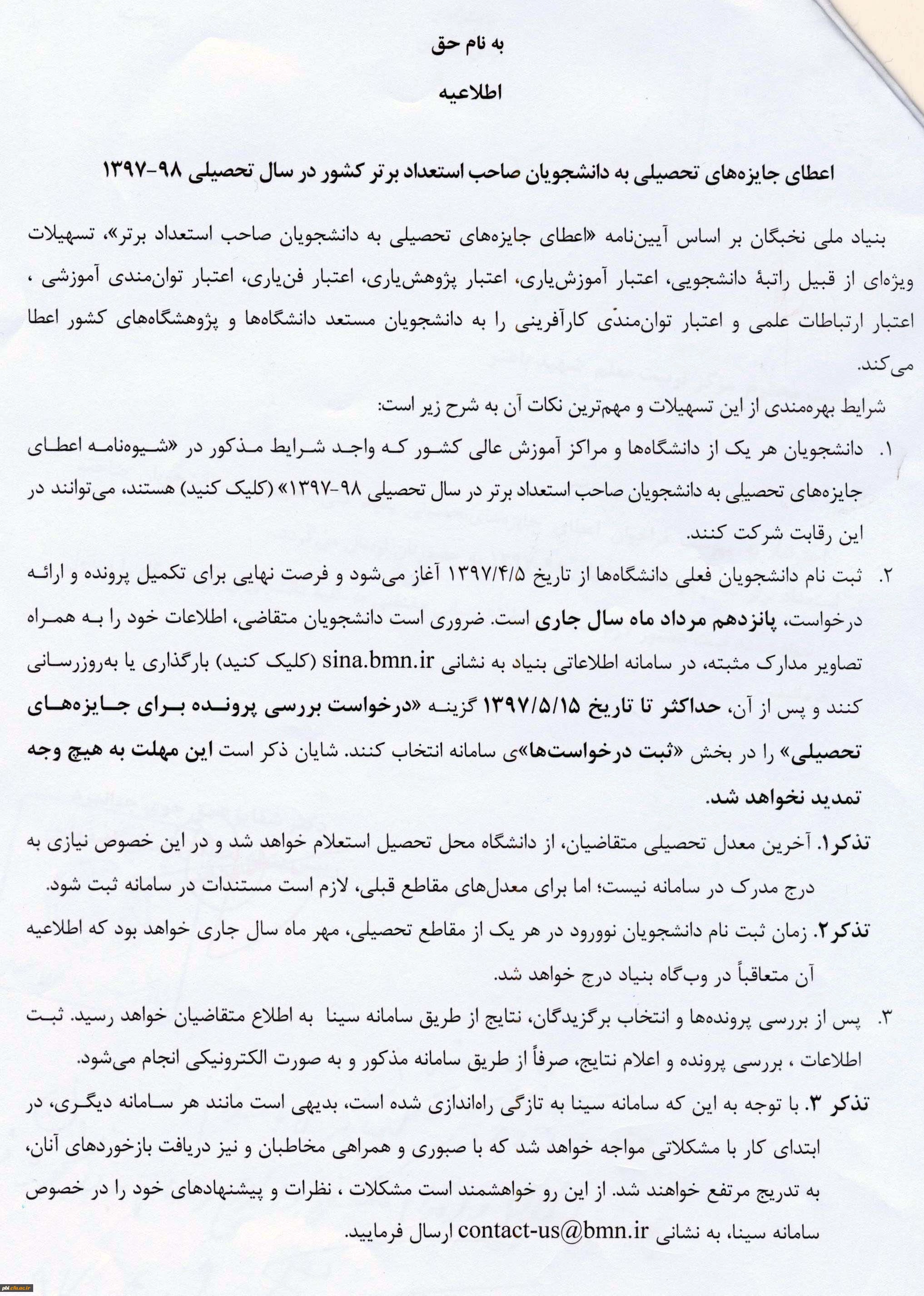 امتیاز دهید : فراخوان اعطای جایزه های تحصیلی بنیاد ملی نخبگان به دانشجویان صاحب استعداد برتر 3 شنبه 9 تیر 1397 ساعت 14:09
