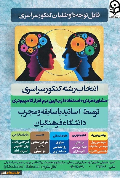امتیاز دهید : مشاوره تحصیلی و انتخاب رشته کنکور سراسری در مرکز مشاوه پردیس شهید باهنر اصفهان 2 چهارشنبه 9 مرداد 1398 ساعت 11:30