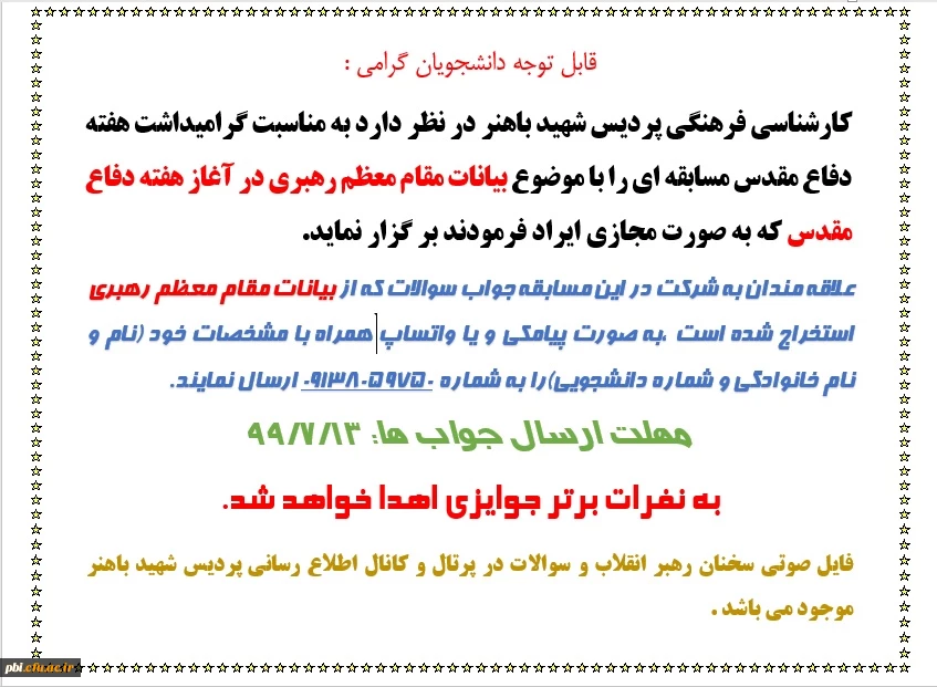 امتیاز دهید : مسابقه فرهنگی با موضوع بیانات مقام معظم رهبری در آغاز هفته دفاع مقدس 2 یکشنبه 6 مهر 1399 ساعت 9:09