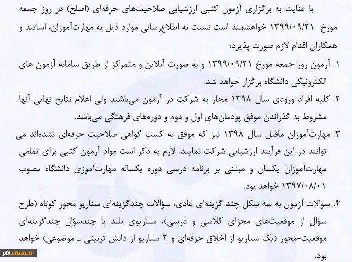 امتیاز دهید : اطلاعیه مهم مهارت آموزان ماده 28 در خصوص برگزاری آزمون اصلح 2 شنبه 8 آذر 1399 ساعت 11:48