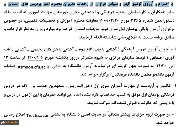 امتیاز دهید : نحوه برگزاری آزمون پودمان اول فرهنگی سری دوم 6 تیر ماه مهارت آموزان 2 چهارشنبه 2 تیر 1400 ساعت 11:37
