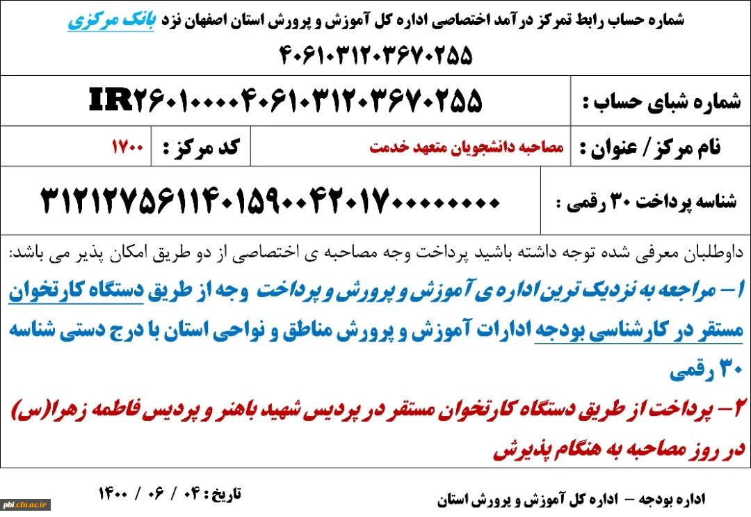 امتیاز دهید : اطلاعیه شماره 2 - چگونگی واریز وجه فرآیند مصاحبه آزمون سراسری 1400 2 پنجشنبه 4 شهریور 1400 ساعت 14:58