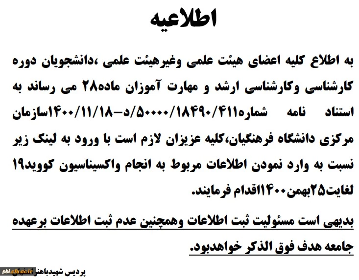 امتیاز دهید : الزام ثبت اطلاعات واکسیناسیون کلیه کارکنان و دانشجویان در تمام مقاطع تحصیلی 3 سهشنبه 19 بهمن 1400 ساعت 9:26