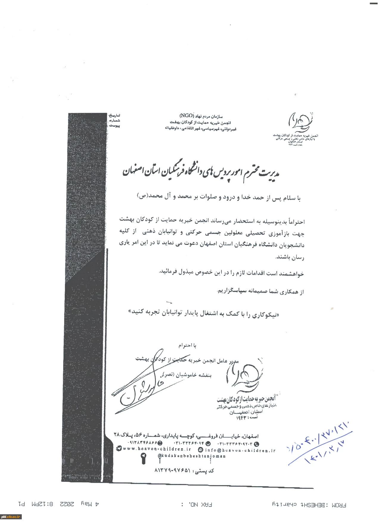 امتیاز دهید : دعوت از دانشجویان خیر به همکاری با موسسه خیریه معلولین بهشت 2 دوشنبه 26 اردیبهشت 1401 ساعت 10:07