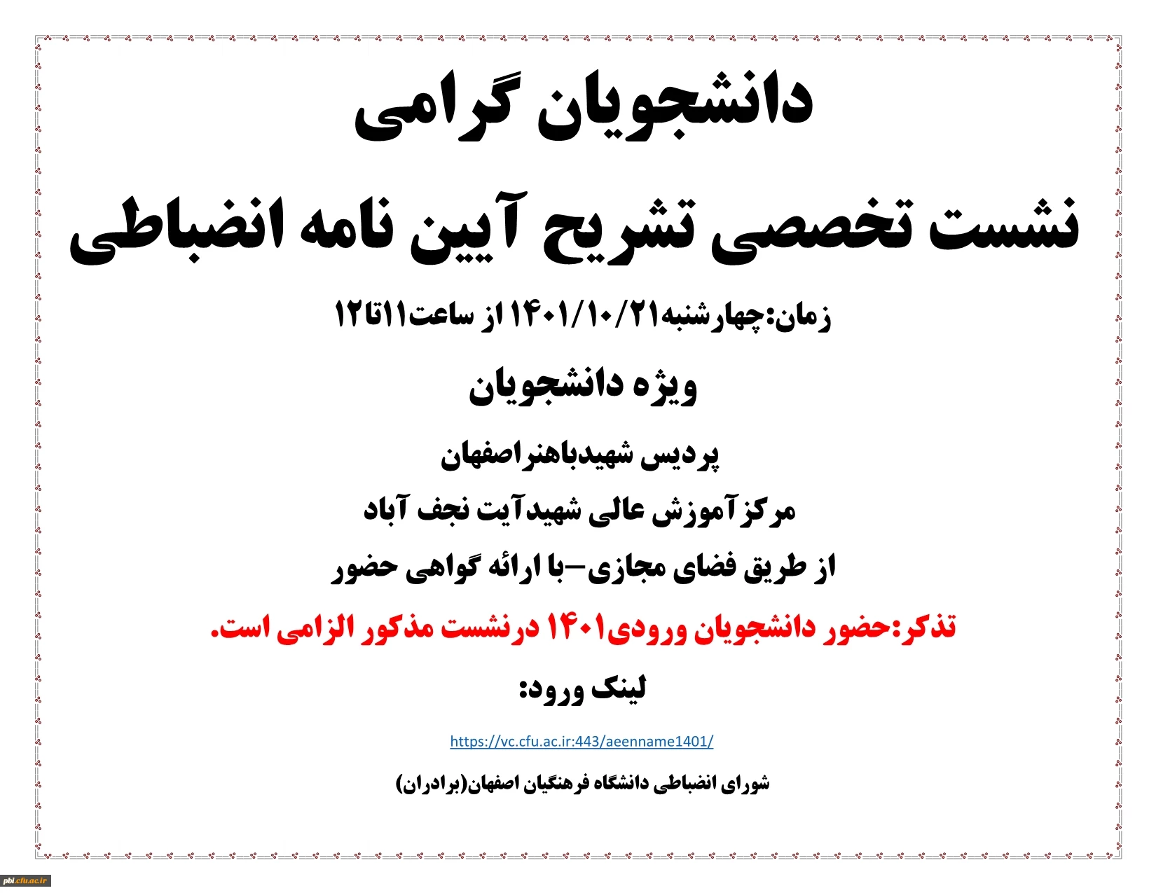 امتیاز دهید : الزام حضور دانشجویان ورودی 1401 در نشست تخصصی تشریح آیین نامه انضباطی 2 شنبه 24 دی 1401 ساعت 12:11