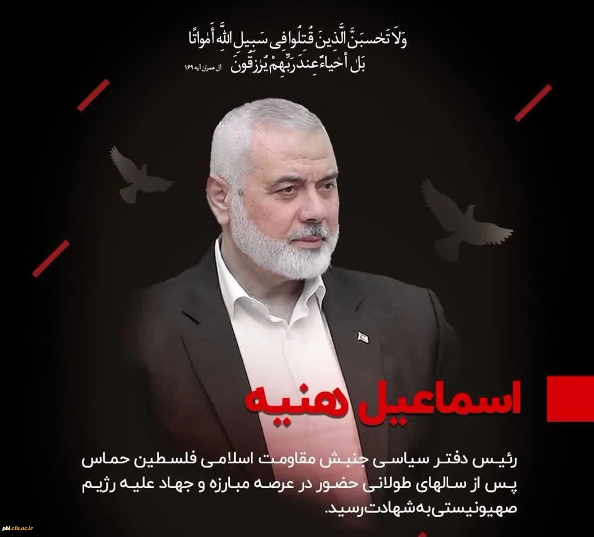 امتیاز دهید : تسلیت شهادت اسماعیل هنیه رئیس دفتر سیاسیِ مقاومت اسلامیِ حماس 2 چهارشنبه 10 مرداد 1403 ساعت 13:25